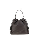 Leather Shoulder Bag by Brunello Cucinelli, top closure by drawstring, adjustable and removable flat handle at top, one compartment, iconic brand signature press-stamped on front.