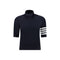 Thom Browne’s Virgin Wool Turtleneck Sweater is a refined and sophisticated piece that combines elegance with distinctive details. With a ribbed turtleneck and short sleeves, it features a monochrome pattern enhanced by contrasting hems. The brand’s iconic bands on the left sleeve and the ribbed hem with slight side slits add a touch of originality.